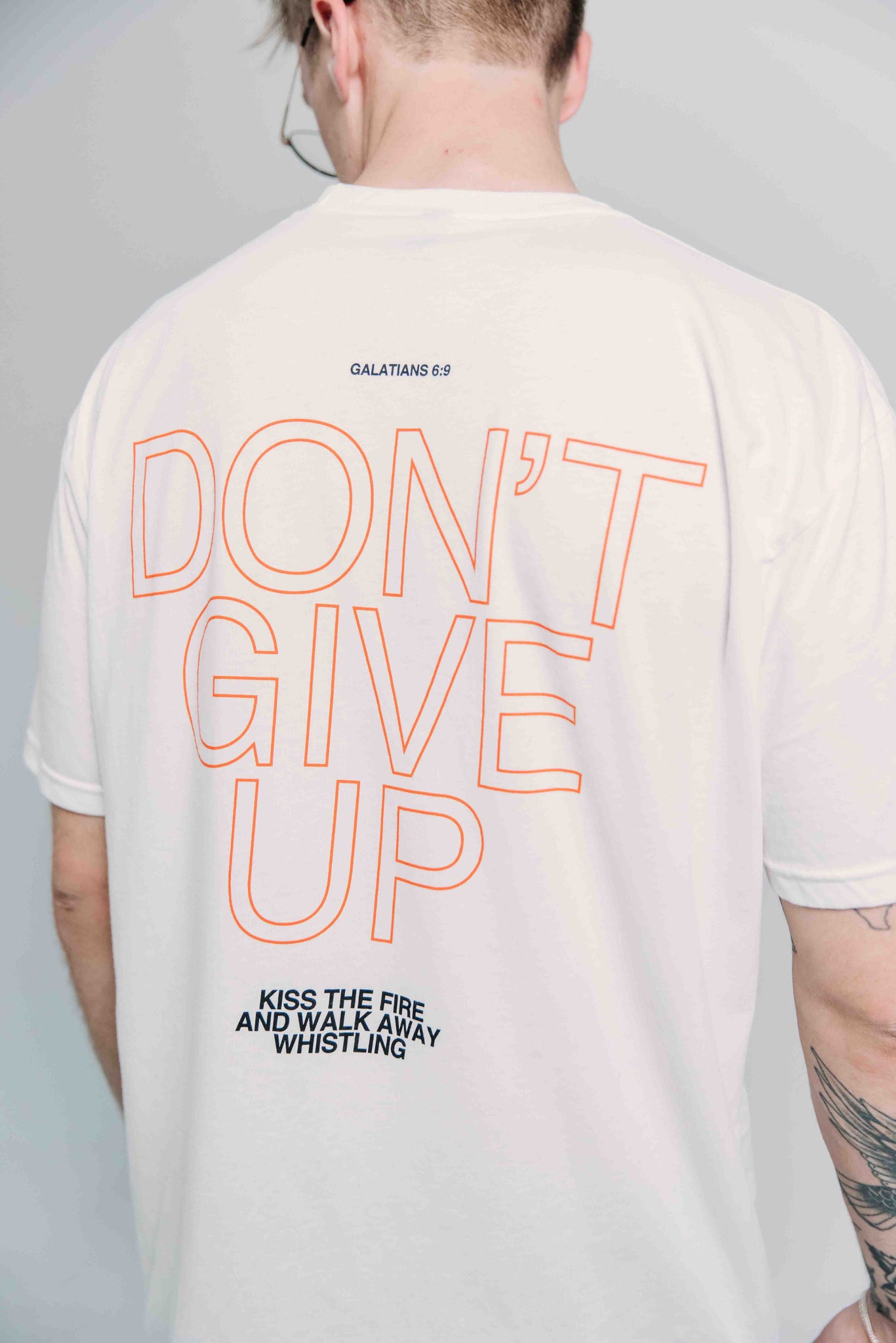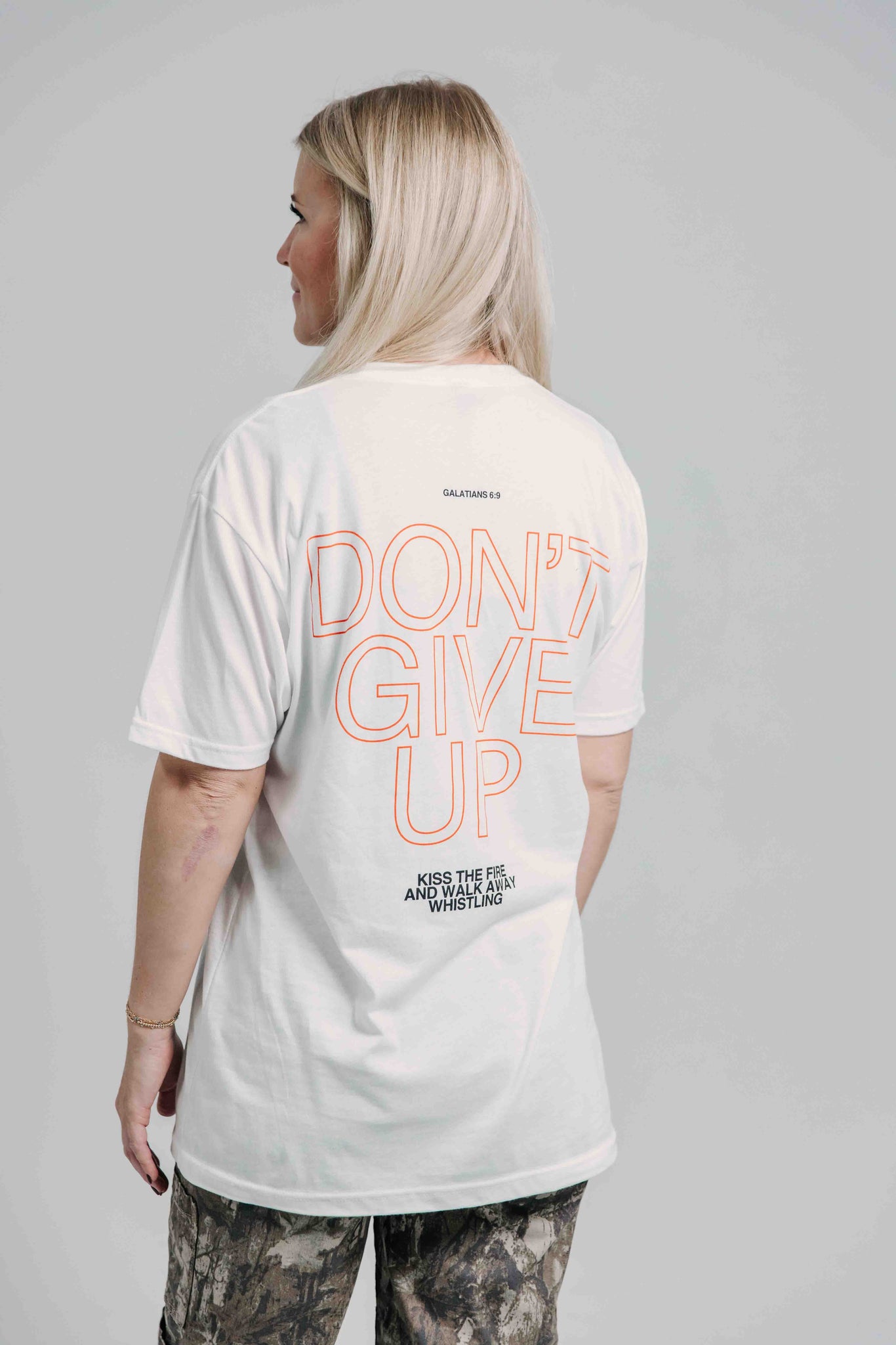 Back graphic: “DON’T GIVE UP” + “Kiss the Fire and Walk Away Whistling”